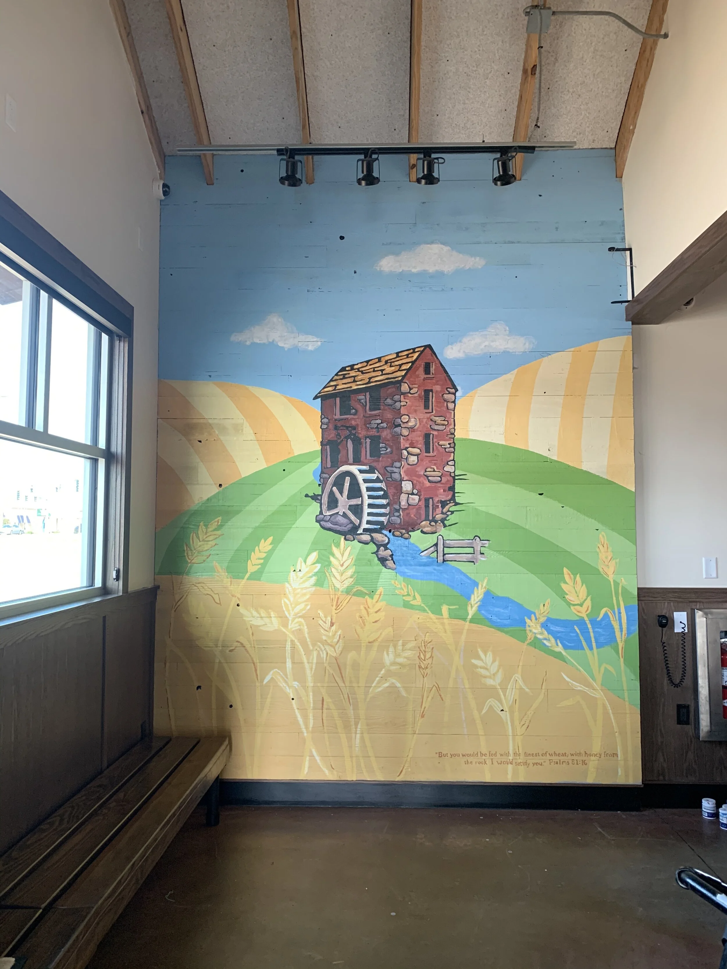 Local Bakery and Deli “Stonemill Bakery” in Fayetteville, Arkansas recently expanded to a second location. The space had a 9’ x 12'4" wall, a perfect opportunity to customize a welcoming mural in their newest space - they reached out! We explored options: pattern, color, modern, classic. But arrived at a reinterpretation of their logo- something that’s been black and white for 24 years, brought to life. In addition, a chalkboard menu was designed and then completed by hand on site.